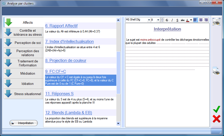 Bien que l' interprétation du test reste du seul ressort "subjectif" du psychologue, cette fonctionnalité fournit différentes pistes et aides pour affiner les conclusions du test.